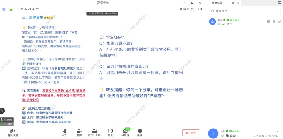 为进一步增强大一新生的安全意识,普及法律法规与校纪校规,10月30日晚9点,安全保卫处联合科教处派出所开展线上校园安全教育专题讲座,内容聚焦校园安全关键领域,取得良好教育成效。约有1300名新生参与本次线上讲座。