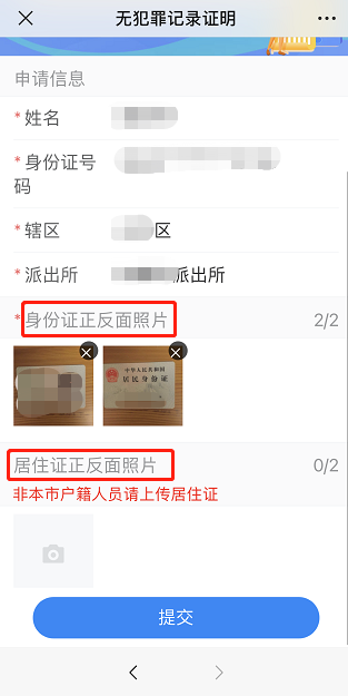 选择辖区和派出所(根据户籍地或居住地选择)。上传身份证或居住证正反面照片(非本市户籍人员需上传居住证)。确认信息无误后点击“提交”。